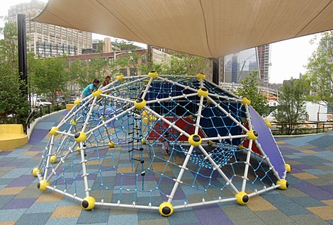The centerpiece of the playground is a giant climbing dome that's reminiscent of those old-school metal structures parents might recall from their youth. But this is no plain-Jane jungle gym. It's jam-packed with a challenging series of ropes for climbing, lounging and generally monkeying around. The floor surface below is cushy underfoot and made into a colorful checkerboard.